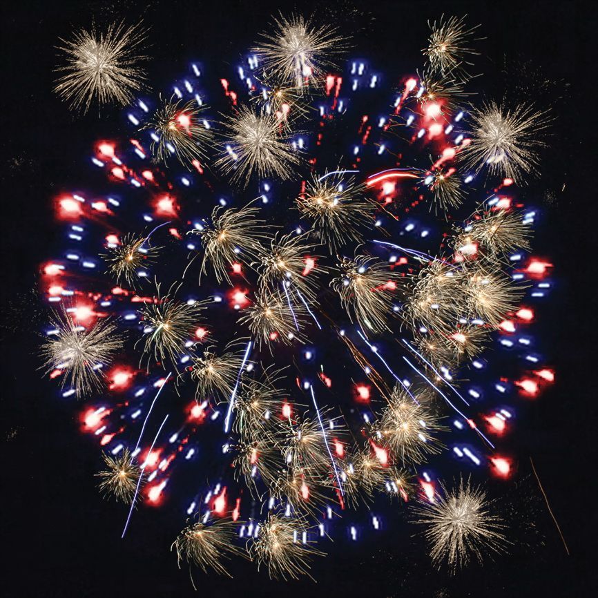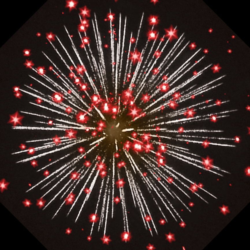 1-2. красных, синих и серебряных трещащих, золотых мерцающих огней;